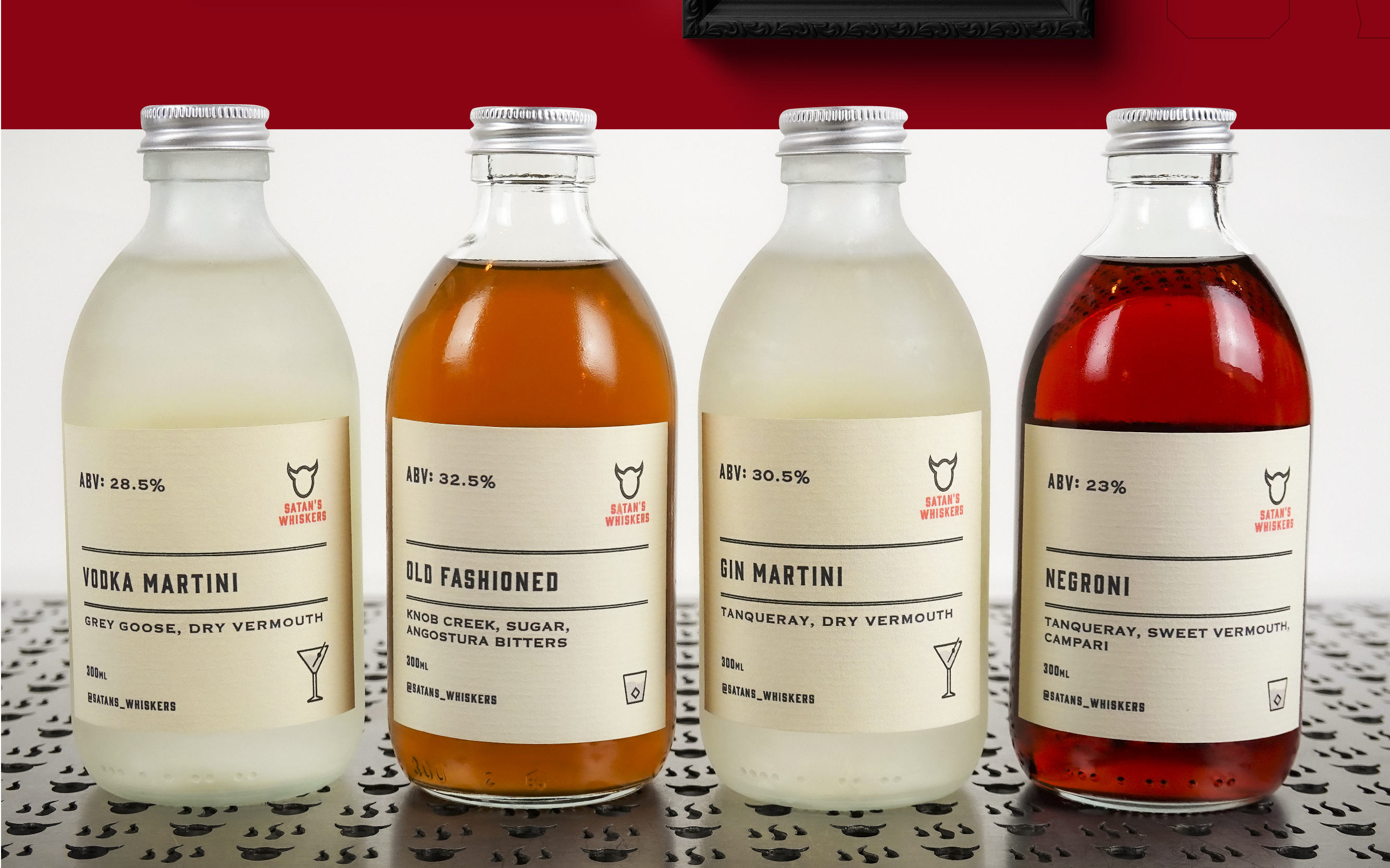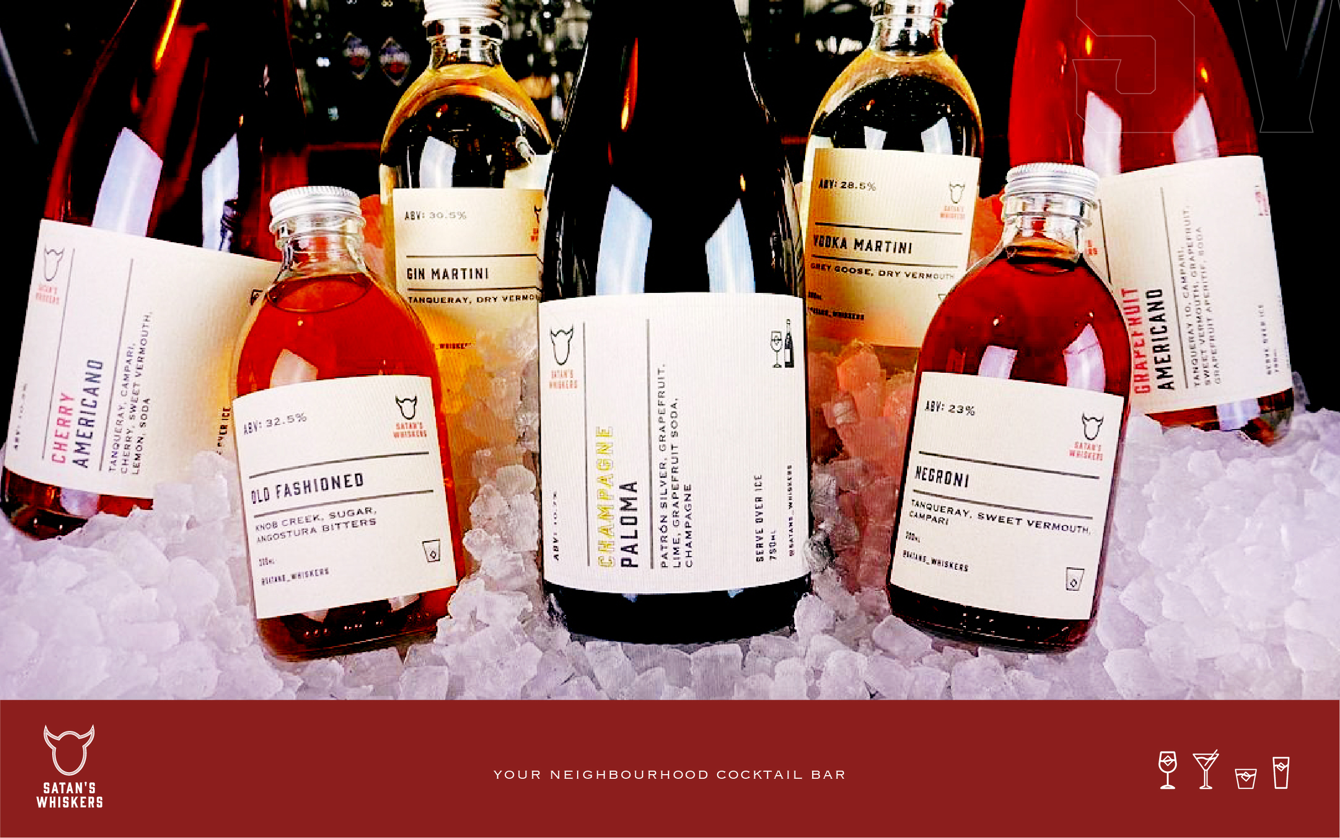 A brand and identity refresh for Satan’s Whiskers Cocktail Bar in East London. From logo mark to menu design, art direction to label design.